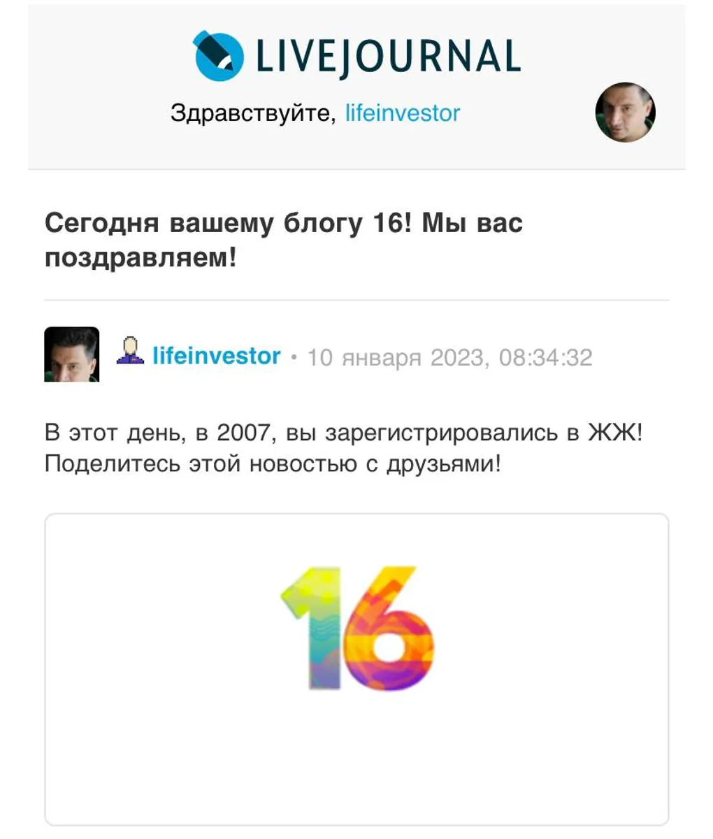 В этом году аккаунт в Живом Журнале исполнилось 16 лет 20 янв. 2023 г. Это репост из Telegram 20 янв. 2023 г. В этом году аккаунт в Живом Журнале исполнилось 16 лет